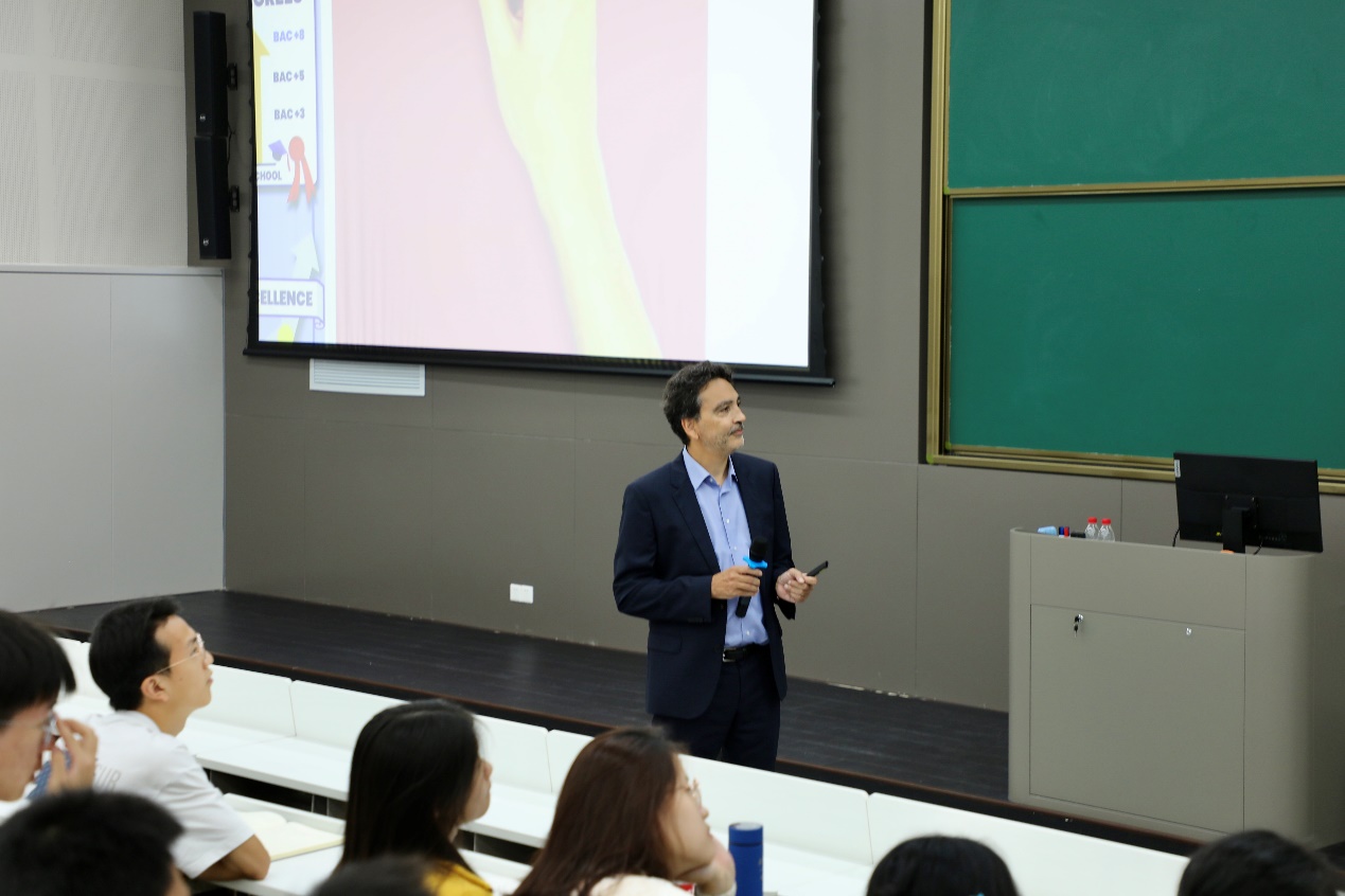 Frédéric Genty, président français de l'Ecole Centrale de Pékin, s'est récemment rendu sur le campus international de l'Université Beihang à Hangzhou pour donner une conférence intitulée « Les ingénieurs internationaux : une vision sino-française » à destination des nouveaux étudiants de licence de la promotion 2023 de l'Institut sino-français d'aviation civile Beihang-ENAC, afin de les aider à planifier leurs études et leur développement futurs. Il s'agit également de la deuxième conférence de laSérie de masterclass. La conférence était présidée par Hong Guanxin, directrice de l'Institut sino-français d'aviation civile Beihang-ENAC.