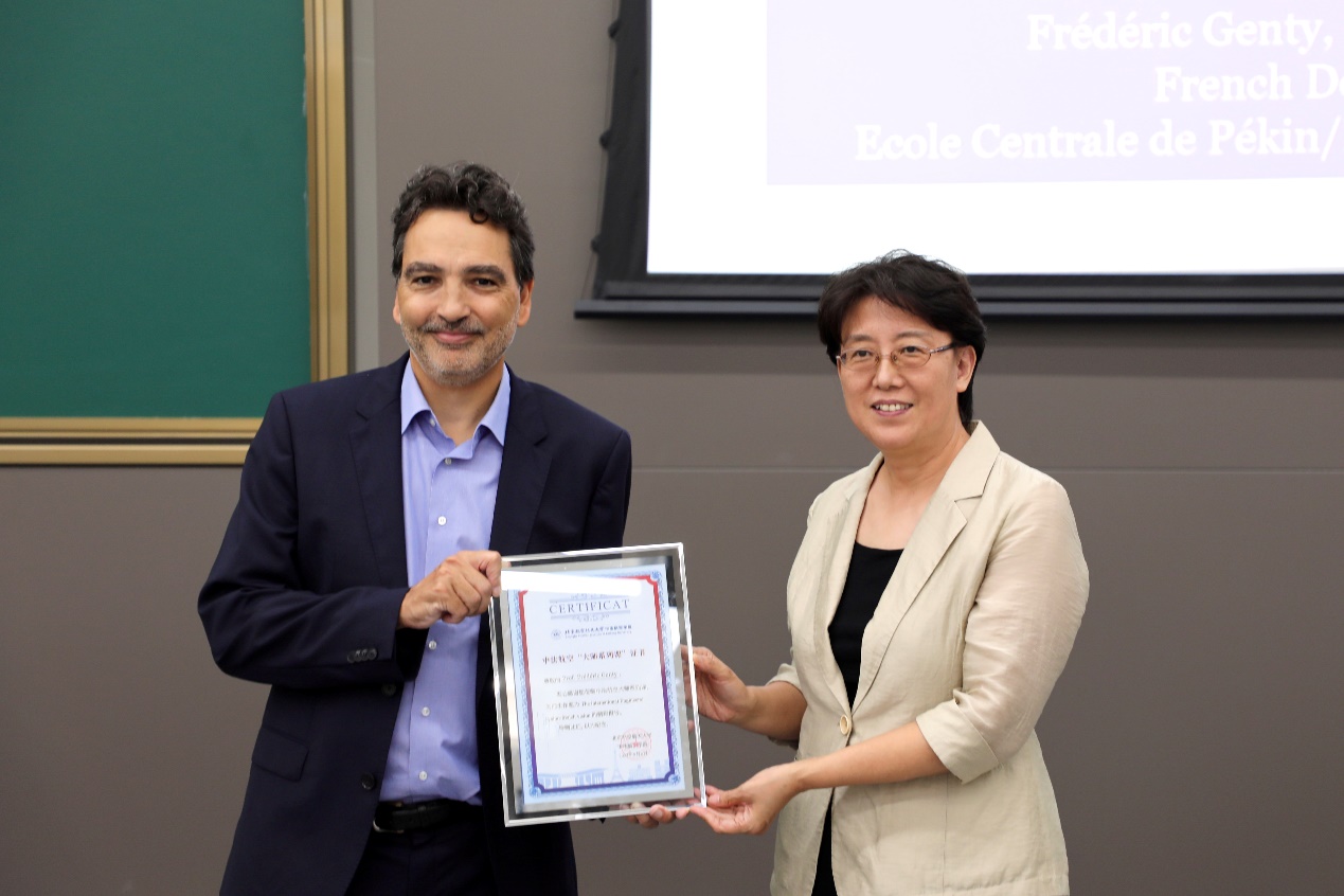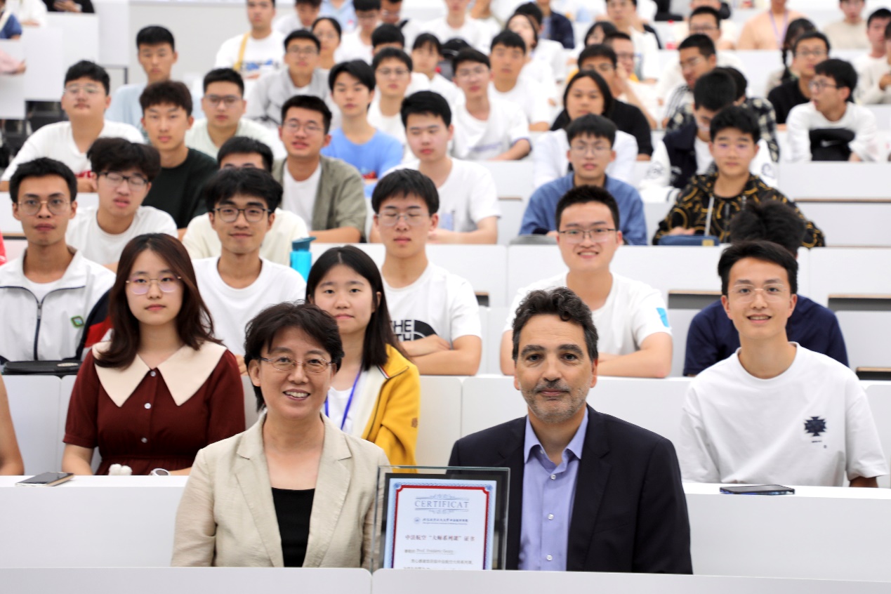 À la fin de l'événement, Mme Hong Guanxin, doyenne de l'institut, a remis le certificat de participation à laSérie de masterclassau professeur Genty et l'a remercié d'être venu à l'Institut sino-français d'aviation civile Beihang-ENAC pour donner cette excellente conférence aux étudiants.