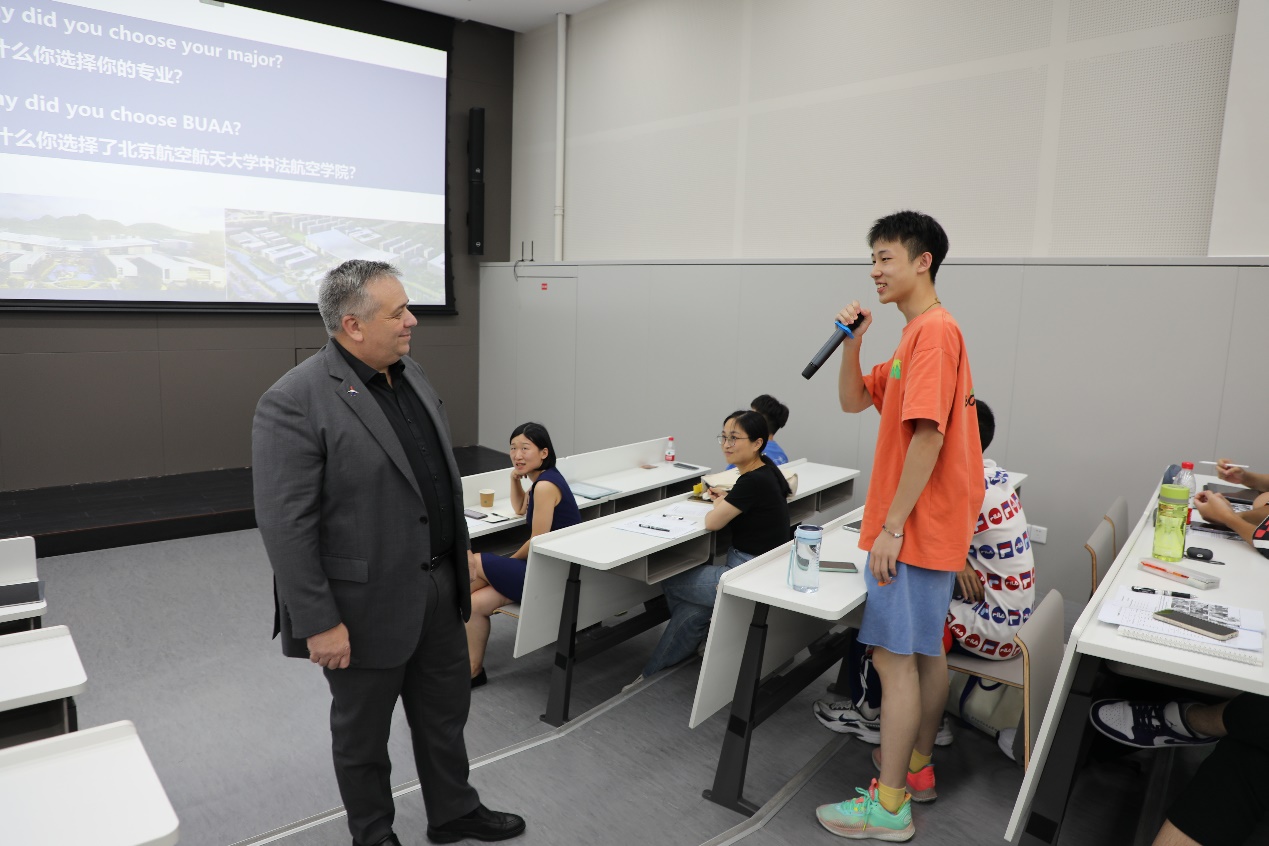 Avant de commencer la conférence, M. DUBARRY a discuté avec les étudiants de deux questions : Pourquoi avez-vous choisi cette spécialité ? Pourquoi avez-vous choisi l'Institut sino-français d'Aviation civile Beihang-ENAC ? « Parce que Beihang est très connu en Chine. Ici, je peux apprendre beaucoup de connaissances aérospatiales », « Parce qu'elle est proche de mon pays natal », « Parce que c’est le destin ». Les réponses variées des étudiants rendent instantanément l'atmosphère de la conférence agréable. C’est à partir de ses sujets que M. DUBARRY a commencé la conférence d'aujourd'hui.