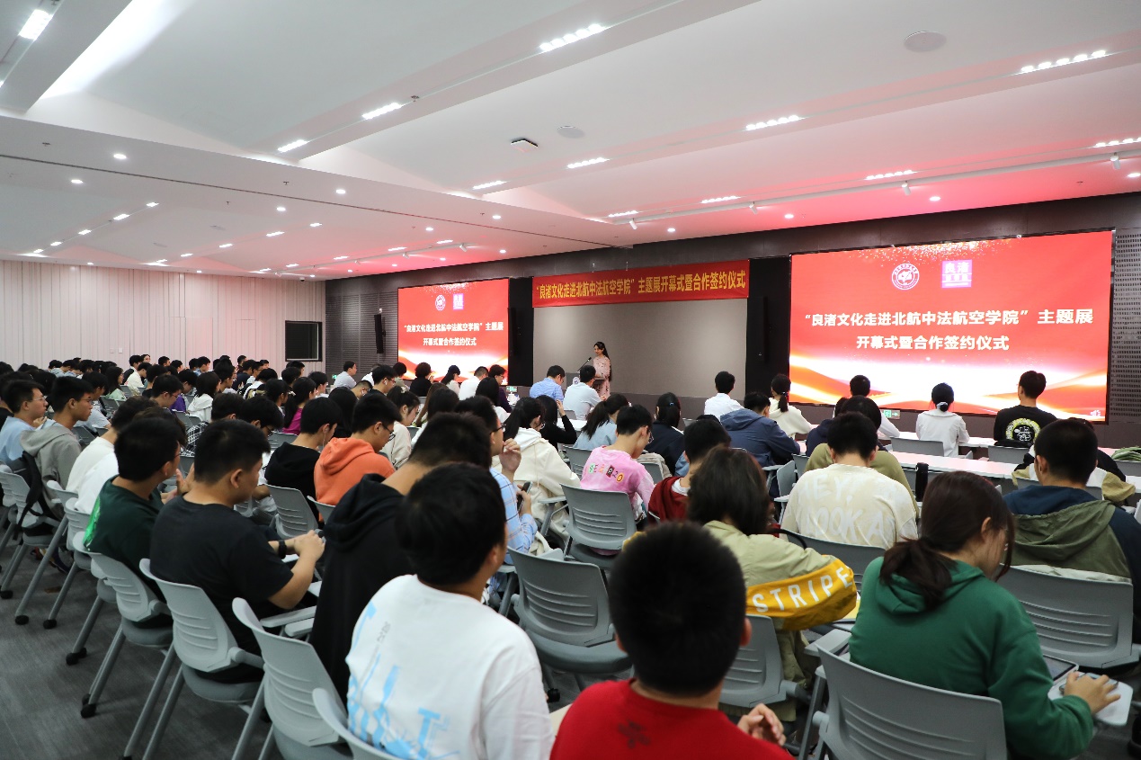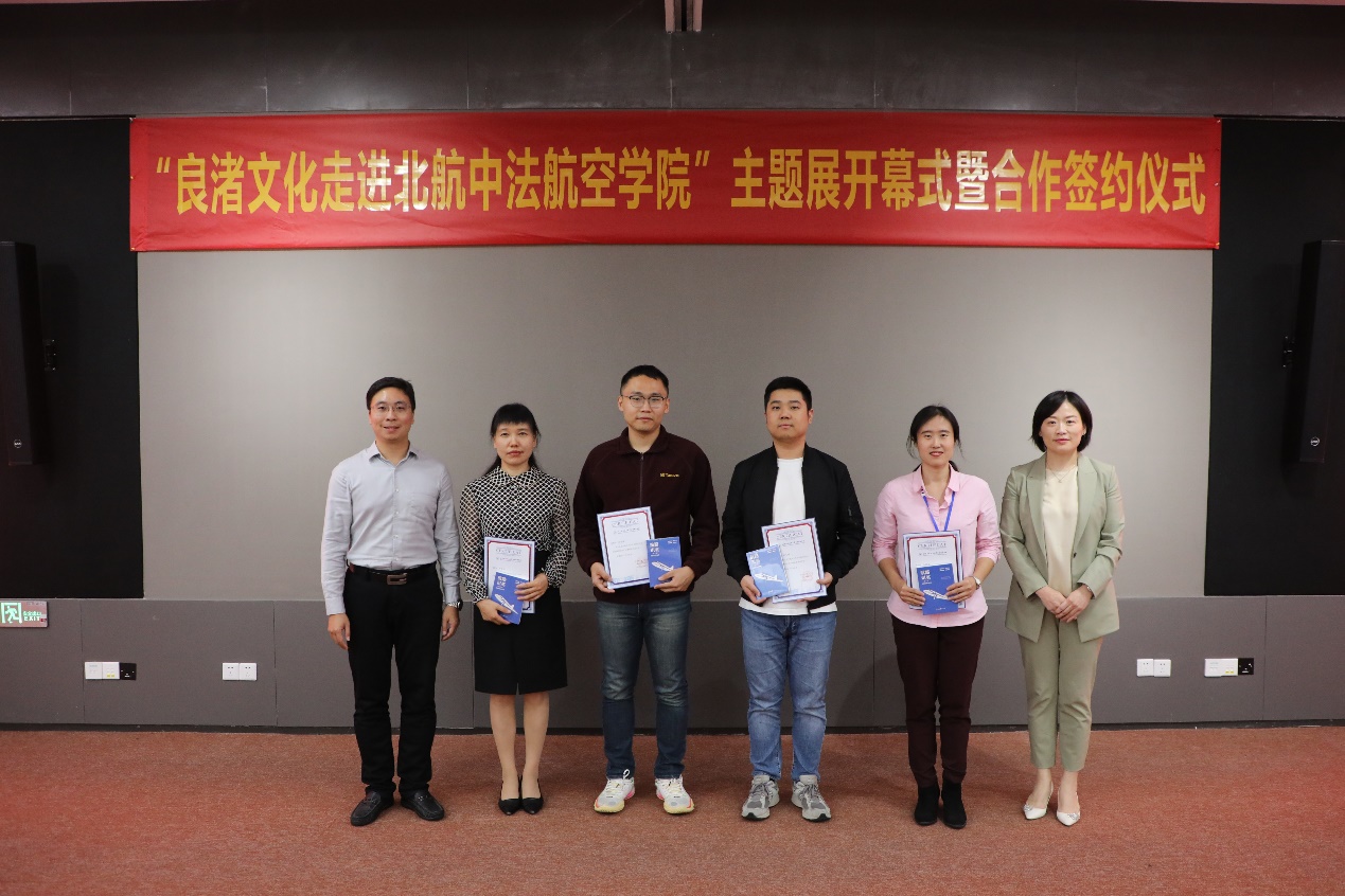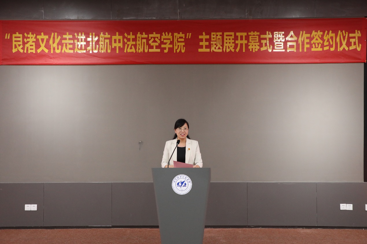 Le 25 octobre dans l'après-midi, la cérémonie d'ouverture de l'exposition « La culture de Liangzhu entre dans le campus de l'Institut sino-français d'Aviation civile Beihang-ENAC » s'est déroulée avec succès dans le centre de conférences du campus. TANG Liyu, membre du Comité permanent du comité du Parti de l'arrondissement de Yuhang et le vice-préfet de Yuhang, YANG Xiaoping, vice-présidente du conseil administratif de la zone de gestion des sites archéologiques de Liangzhu, SHEN Qing, secrétaire du comité du Parti du bourg de Pingyao, MA Dongfeng, directeur général du musée de Liangzhu (Institut de Liangzhu), XU Laiying, PDG de l'entreprise Hangzhou Yuhang Cultural Tourism Investment Group Co., Ltd., YING Hangjun, secrétaire général de la Fondation pour la protection et la recherche sur la culture de Liangzhu de Yuhang, ont assisté à l'événement. En plus, plus de 200 personnes de notre institut ont participé à l'événement, dont HONG Guanxin, directrice de l'institut et les autres membres du conseil d'administration, les étudiants de premier cycle et des enseignants.