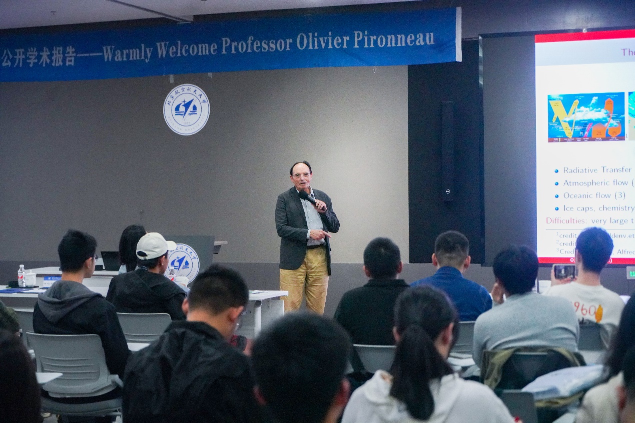 (Texte et Image/LI Fei) Le 27 octobre, le professeur Olivier PIRONNEAU, académicien de l’Académie des sciences de France et professeur à Sorbonne Université, a été invité à visiter le campus international de l’Université Beihang à Hangzhou. Il a présenté aux enseignants et aux étudiants une conférence académique intitulée : « Le transfert radiatif dans une atmosphère nuageuse et l’impact des traînées d’avions sur le climat ». Ont assisté à cet événement : M. ZHAO Weisheng, vice-président de l’Université Beihang ; Mme HONG Guanxin, directrice et secrétaire adjointe du Comité du Parti de l’Institut International d’Innovation de l’Université Beihang à Hangzhou (H3I) ; M. ZHANG Xiao, secrétaire du Comité du Parti de la Faculté des Sciences Mathématiques de l’Université Beihang ; M. YING Weidong, secrétaire adjoint du Comité du Parti de H3I ; ainsi que M. ZHANG Wei, directeur adjoint de H3I. Plus de 200 enseignants et étudiants issus de H3I, de la Faculté des Sciences Mathématiques, de la Faculté des Sciences et de l’Ingénierie des Circuits Intégrés et de la Faculté d’Intelligence Artificielle étaient également présents.