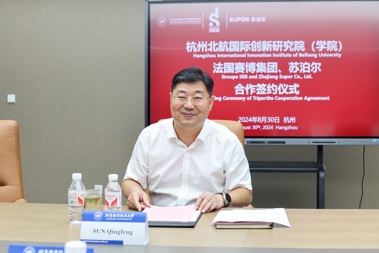(Texte/XU Ran Image/XIE Yuqian) Le 30 août, Thierry de LA TOUR D'ARTAISE, président-directeur général du Groupe SEB, Vincent TAI, président de la région Asie du Groupe, ainsi que YE Jide, vice-président de Zhejiang SUPOR Co., Ltd., YAN Jueming, directeur du Centre d’Innovation, et JIN Yi, directeur des ressources humaines, ont visité le campus international de l’Université Beihang à Hangzhou. Cette visite visait à approfondir la coopération entre l’université et l’entreprise. SUN Qingfeng, secrétaire du Comité du Parti de l’Institut International d’Innovation de l’Université Beihang à Hangzhou (H3I), a accueilli chaleureusement les invités.