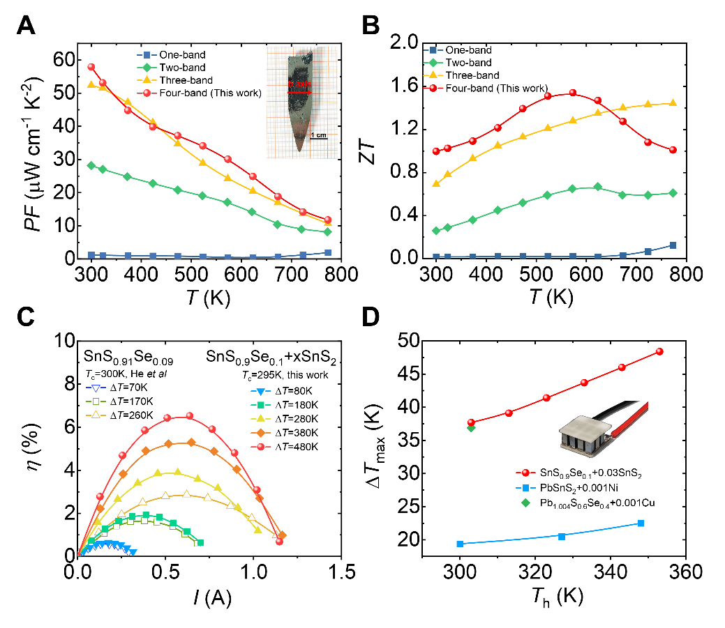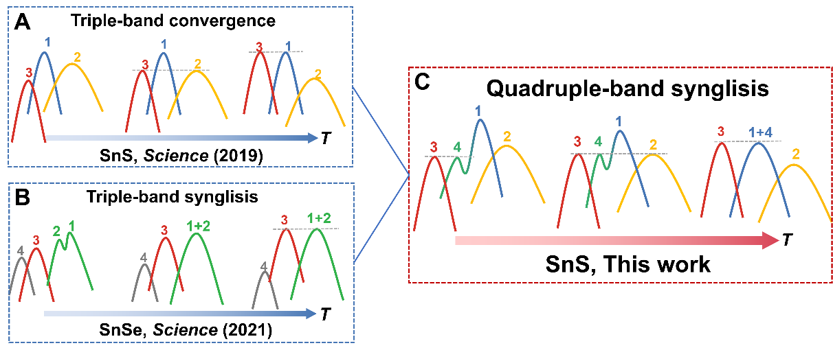 Tout en développant des cristaux de SnSe, l’équipe s'est également concentrée sur le développement de matériaux thermoélectriques hautes performances avec des réserves plus abondantes, des coûts plus faibles et des bandes interdites plus larges. En tant qu'analogue de SnSe, le sulfure d'étain (SnS) (abondance de réserve : S ≈ 420 ppm, Se ≈ 0,05 ppm) est l'un des composés cibles. Les matériaux à large bande interdite sont généralement des isolants à l'état non dopé. Pour résoudre ce problème, l'équipe a d'abord augmenté la mobilité des porteurs de charge en cultivant des cristaux de haute qualité, puis a régulé la structure de la bande électronique pour améliorer les performances de transport électrique. Des recherches antérieures ont révélé et exploité le processus d'évolution de la convergence entre les trois bandes de valence du SnS avec l'augmentation de la température (« convergence à triple bande », Triple-Band Convergence comme le montre la Figure 2A), découplant la contradiction entre la masse effective et la mobilité des porteurs de charge [Science 365 (2019) 1418-1424]. Par la suite, l'équipe a optimisé de manière significative les performances thermoélectriques à température proche de la température ambiante des cristaux de SnSe de type P en activant l'effet synergique des trois bandes de valence du SnSe dans l'espace d'énergie et d'impulsion (« synergie à trois bandes » Triple-Band Synglisis, Figure 2B), et a développé pour la première fois le potentiel de refroidissement thermoélectrique du SnSe [Science 373 (2021) 556-561]. Les recherches ci-dessus conduisent à une idée : est-il possible de développer des matériaux de refroidissement avec des bandes interdites plus larges en activant davantage de bandes d'énergie ?
