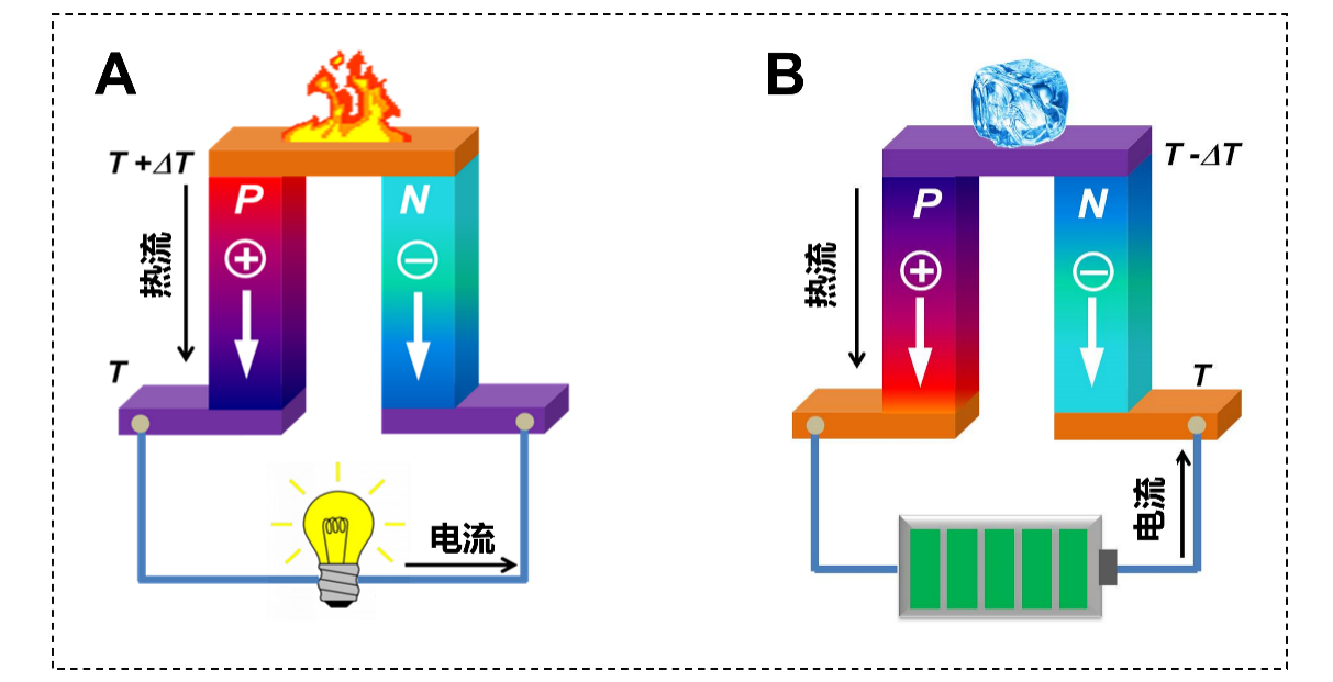 Figure 1. Effet thermoélectrique : (A) Schéma de principe de la production d’électricité par différence de température basée sur l'effet Seebeck ; (B) Schéma de principe du refroidissement thermoélectrique basé sur l'effet Peltier