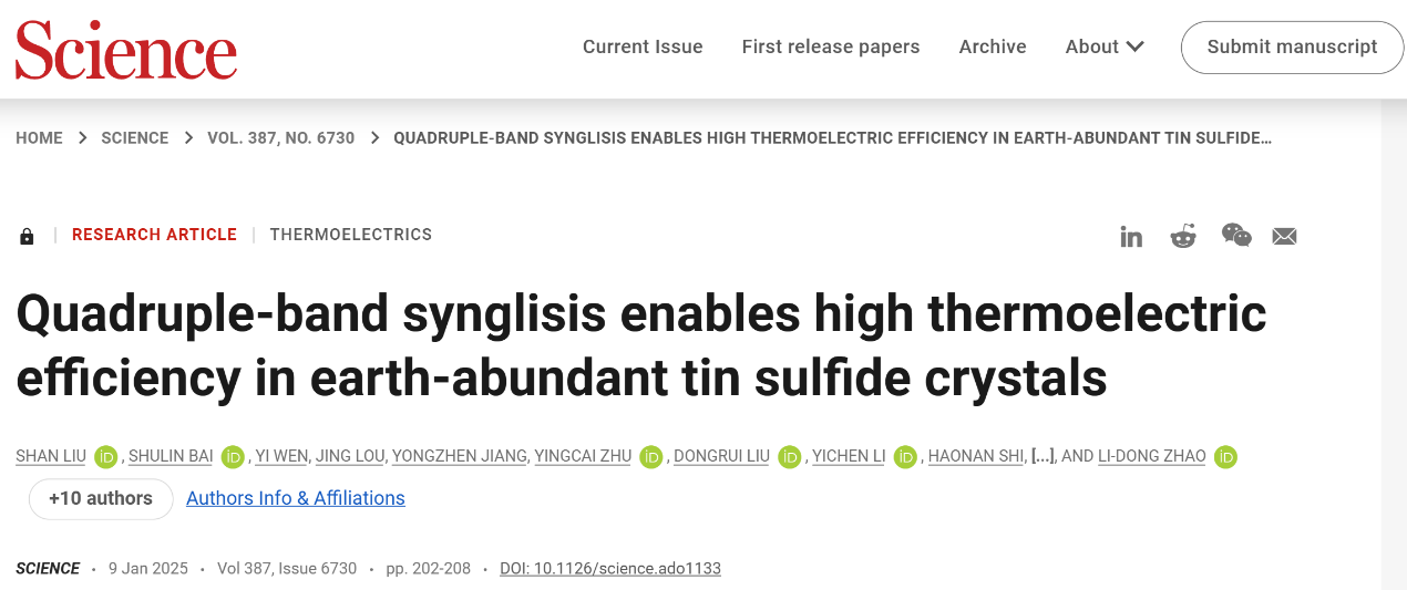 Le 10 janvier, la revue internationale de renom Science a rapporté les derniers progrès réalisés par l'équipe de recherche du professeur ZHAO Lidong du Centre d’innovation de la science et de la technologie bio-inspirées de l'Institut international d'innovation de l'Université Beihang dans le domaine de la recherche sur les matériaux et dispositifs thermoélectriques à grande capacité de stockage, à faible coût et à large bande interdite : Quadruple-Band Synglisis Enables High Thermoelectric Efficiency in Earth-Abundant Tin Sulfide Crystals. Ce travail a découvert et régulé l'effet synergique de quatre bandes de valence (Quadruple-Band Synglisis) dans l'espace d'énergie et d'impulsion dans les cristaux de sulfure d'étain (SnS), atteignant une différence de température de refroidissement d'environ 48 K et une efficacité de production d'énergie d'environ 6,5 % dans les cristaux de SnS de type P. Traditionnellement, les matériaux idéaux pour le refroidissement thermoélectrique sont ceux dont la bande interdite se situe dans la plage de Eg ≈ 6-10 kBT (où kB est la constante de Boltzmann). (Goldsmid, et al. Thermoelectric Refrigeration, Springer, 1964.). Ce travail montre que le SnS avec une bande interdite Eg aussi large que 46 kBT peut également être utilisé comme matériau de refroidissement thermoélectrique [Science 387 (2025) 202-208.].