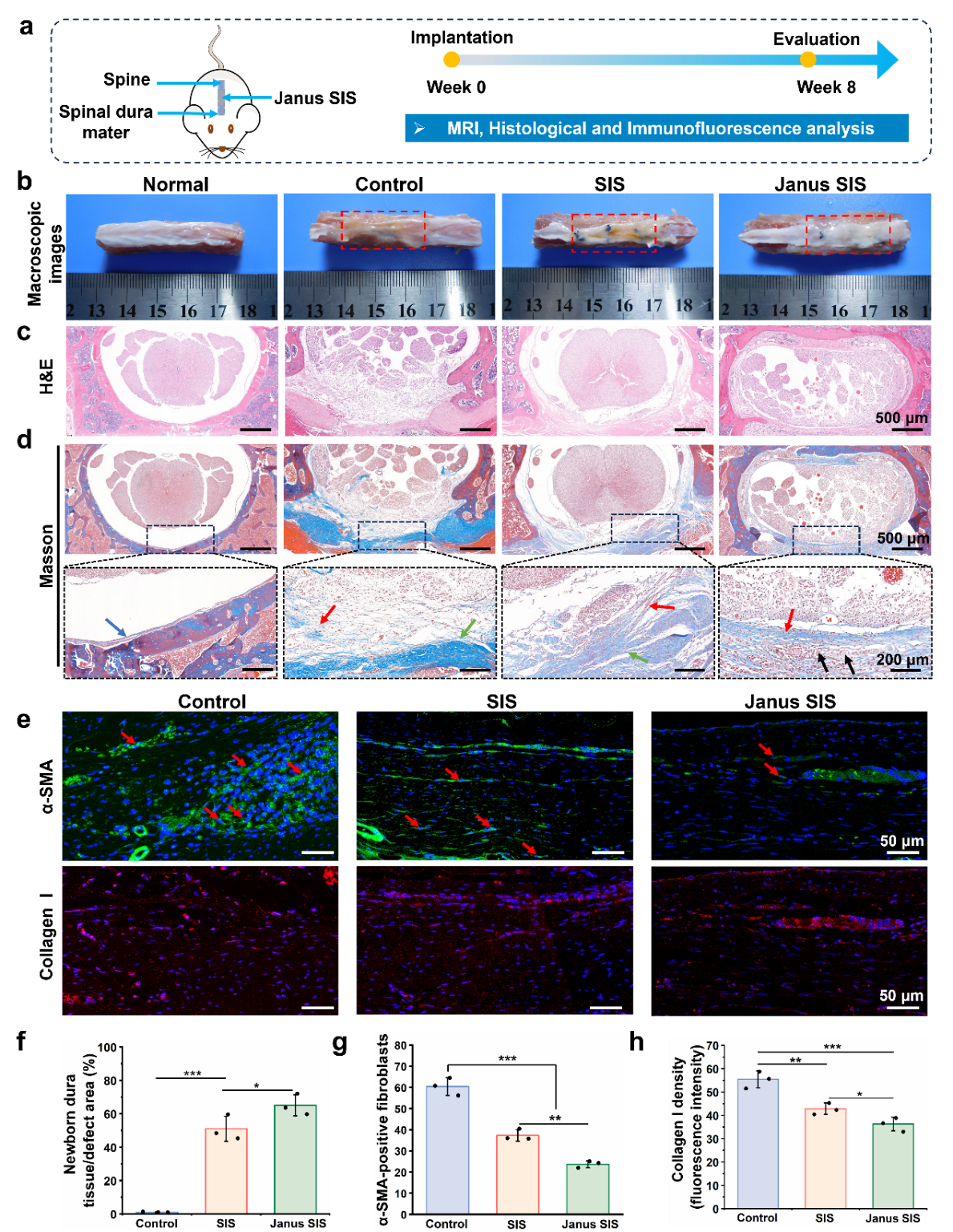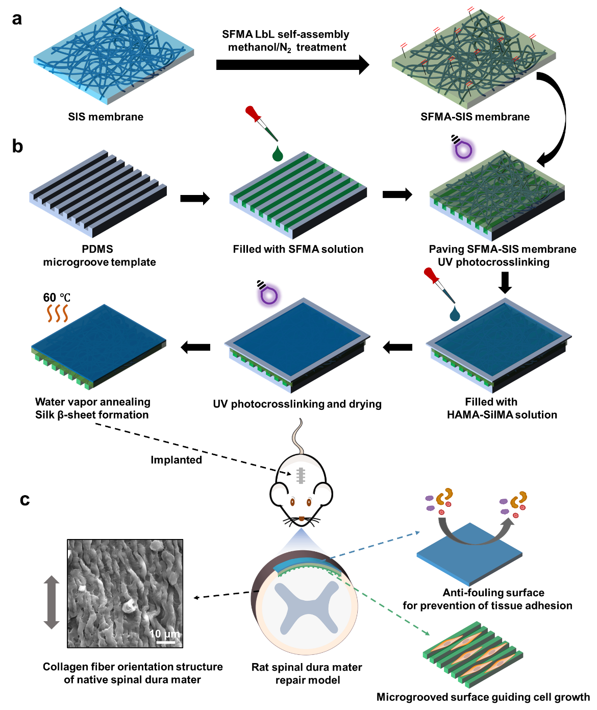 L'équipe du professeur FAN Yubo a mis au point une membrane Janus innovante à partir de la sous-muqueuse intestinale grêle (SIS). Grâce à un revêtement d’hydrogel à base de soie appliqué à sa surface, la membrane assure à la fois la réparation de la dure-mère et la prévention des adhérences épidurales. La face interne, composée d’un revêtement microstructuré (SFMA) associant de la fibroïne de soie (SF) et de la fibroïne méthacrylée (SilMA), guide la croissance orientée des cellules et favorise la régénération de la dure-mère. La face externe, constituée d’un mélange d’acide hyaluronique méthacrylé (HAMA) et de SilMA, empêche l’adsorption des protéines et l’adhésion cellulaire, inhibant ainsi la fibrose épidurale (Figure 1).