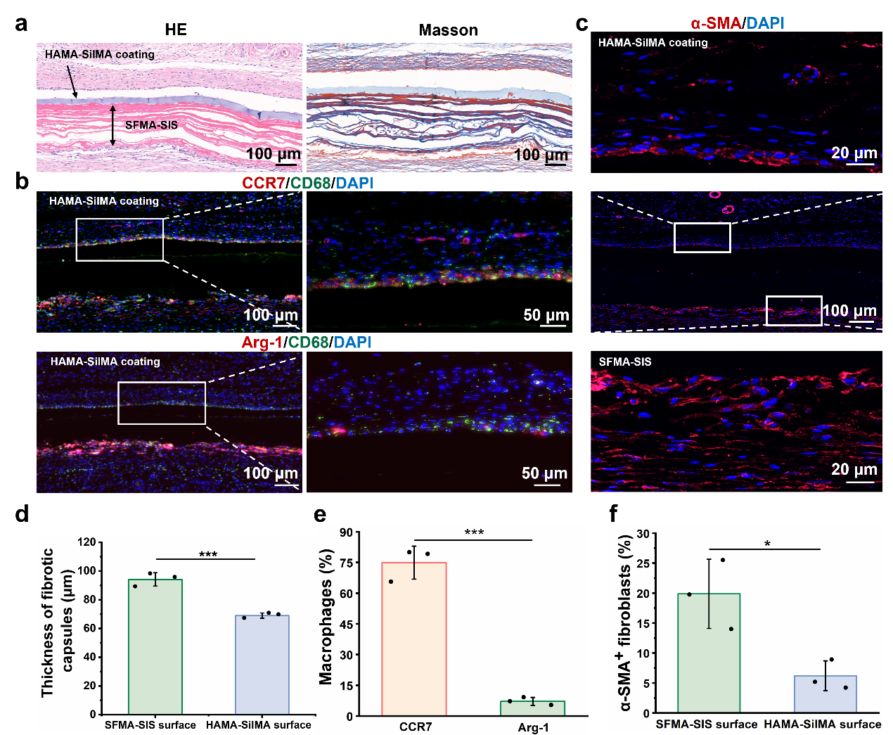 L'évaluation histologique a montré (Figure 5) que 14 jours après l'implantation, la surface du revêtement HAMA-SilMA agissait comme une barrière protectrice, était clairement séparée du tissu hôte et bloquait efficacement l'invasion des cellules et des tissus hôtes, réduisant ainsi le degré d'adhésion tissulaire. Les macrophages du côté HAMA-SilMA présentaient un phénotype M1 plus élevé et montraient une capsule fibreuse plus fine et une expression plus faible de fibroblastes α-SMA positifs.