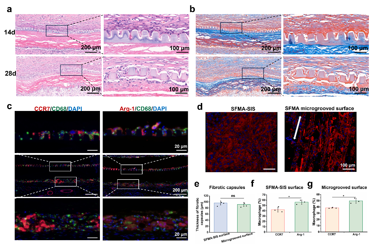 L'étude a utilisé un modèle expérimental animal de rat SD pour vérifier davantage la stabilité des micro-rainures et leur intégration aux tissus. Comme le montre la Figure 4, la structure des micro-rainures a commencé à se désintégrer 28 jours après l'implantation et un grand nombre de cellules hôtes étaient réparties dans les micro-rainures. La surface des micro-rainures SFMA et la surface SFMA-SIS présentaient toutes deux une formation de capsule fibreuse similaire et le revêtement des micro-rainures était bien intégré au tissu hôte. La surface des micro-rainures SFMA et la surface SFMA-SIS étaient toutes deux dominées par des macrophages Arg-1 positifs, confirmant que le revêtement des micro-rainures SFMA est similaire à la membrane SIS bioactive et peut favoriser la polarisation des macrophages vers le phénotype M2.