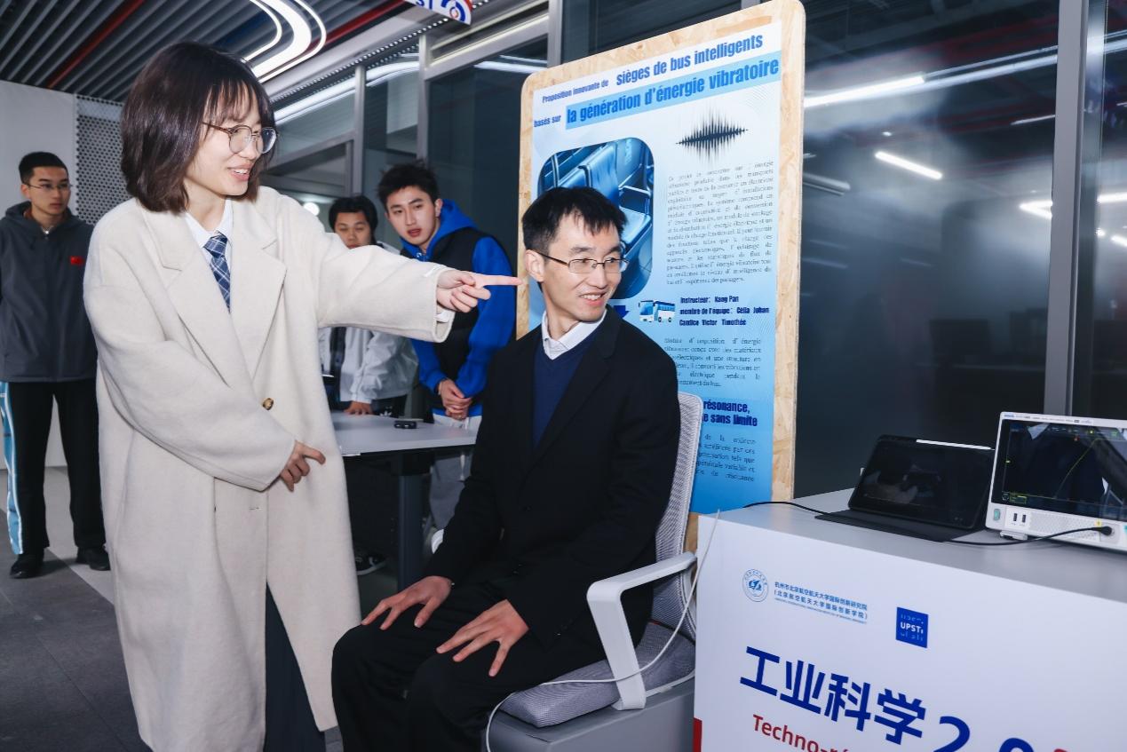 Au stand des « sièges de bus intelligents », les étudiants ont invité les visiteurs à s’asseoir sur le siège-modèle dans lequel est installé un micro-dispositif de génération d’électricité à partir des vibrations. Les membres de l’équipe du projet ont fait des démonstrations en donnant des explications : « L’énergie des vibrations produite par le bus en mouvement peut se convertir en électricité à l’aide de matériaux piézoélectriques, fournissant ainsi de l’énergie aux équipements électroniques embarqués sur le bus. » M. PAN Changqing a essayé en personne le siège et a vérifié les données en temps réel. Il se disait impressionné par cette idée innovante de convertir les « vibrations inutiles » en un « micro-réseau d’électricité ».