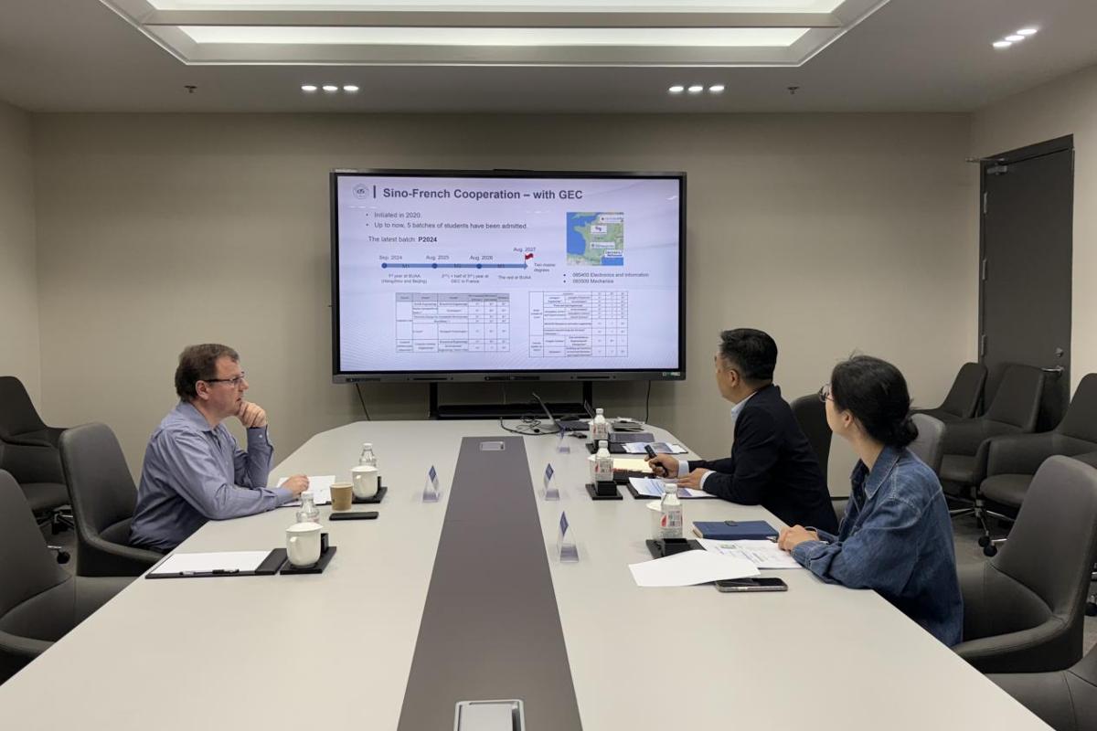 Il s’est entretenu, le 22 avril, avec M. DONG Zhuoning, directeur de l’Institut international d’innovation de l’Université Beihang. Lors de l’entretien, M. DONG a adressé ses remerciements au Groupe des Écoles Centrale pour son soutien constant apporté à l’Institut international d’innovation de l’Université Beihang, tant dans le développement des partenariats de l’Institut avec la France que dans le développement de haute qualité du programme de double diplôme. Le professeur FLEURY a hautement salué l’excellence académique des étudiants intégrant le programme de double diplôme ainsi que la performance remarquable de l’Université Beihang en matière de formation des étudiants. Les deux parties ont exprimé leur volonté commune de poursuivre la construction du laboratoire conjoint Beihang-Groupe des Écoles Centrale de la neutralité carbone, de renforcer la collaboration dans l’innovation scientifique sino-européenne, d’approfondir les partenariats globaux avec les entreprises locales et enfin, de promouvoir l’intégration entre l’industrie et l’éducation pour soutenir mieux la formation des talents de demain.