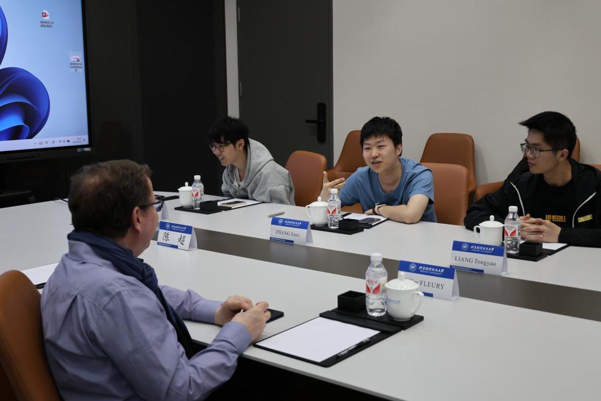 Pendant son séjour, le professeur FLEURY a eu des échanges approfondis avec les étudiants inscrits au programme de double diplôme Beihang-Groupe des Écoles Centrale, actuellement en formation sur le campus de Hangzhou. Les représentants des étudiants présents s’apprêtent tous à rejoindre les établissements du Groupe des Écoles Centrale en France en septembre. Ils ont discuté en détail avec le professeur FLEURY de leurs projets d’études et de recherche en France, de leur choix de campus d’accueil et de la communication avec leurs directeurs de recherche. M. FLEURY leur a prodigué des conseils personnalisés, en tenant compte des orientations académiques et professionnelles de chacun. Selon le professeur FLEURY, dans le cadre du modèle de cotutelle sino-française, les étudiants du programme de double diplôme sont à la fois des explorateurs académiques et des «traits d’union» dans la coopération scientifique sino-française. Les deux établissements peuvent, grâce à cette approche «de bas en haut», favoriser une coopération approfondie dans les domaines de recherches fondamentale et appliquée.