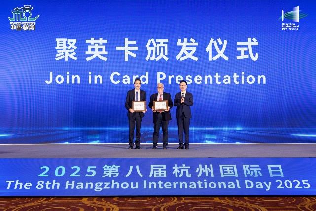 Lors de la cérémonie, Monsieur ZHANG Dengfeng, vice-maire de Hangzhou et secrétaire du comité du Parti du district de Binjiang, a officiellement remis la « Carte Join in » à Monsieur GENTY. La « Carte Join in », dont le nom symbolise le rassemblement des talents venus du monde entier, fait également office de pièce d’identité. Elle intègre les informations relatives au permis de travail des étrangers en Chine dans la carte de sécurité sociale chinoise, offrant ainsi un service « tout-en-un ». Cette carte innovante permet aux talents étrangers travaillant à Hangzhou d’accéder à une gamme complète de services : authentification d’identité, opérations financières, assurance médicale, transports publics, réductions pour les activités culturelles et touristiques, entre autres. Monsieur Frédéric GENTY est le premier expert étranger à Hangzhou à recevoir cette carte.